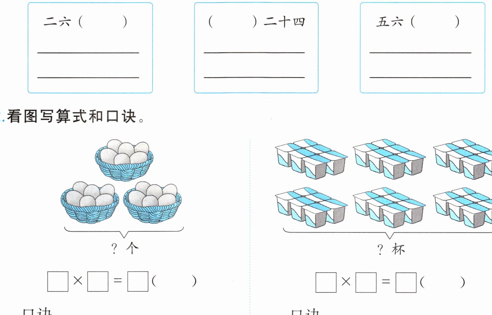 1. 先把口诀补充完整,再各写出两个乘法算式。
