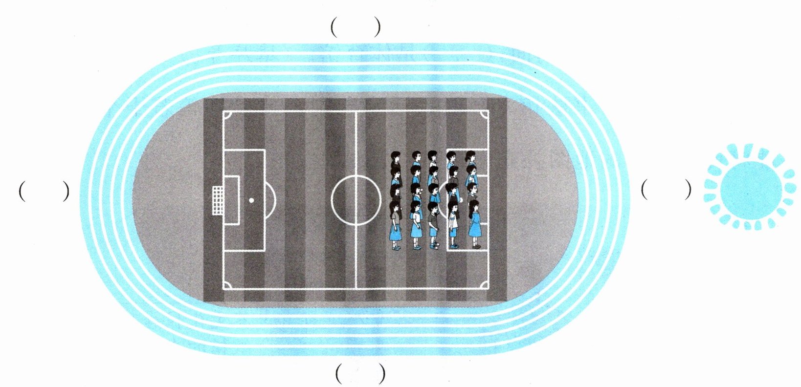 1. 早晨,二(1)班同学们来到操场集合,面向太阳排队站好,请你根据下图中的信息在括号里填写“东”“南”“西”“北”。