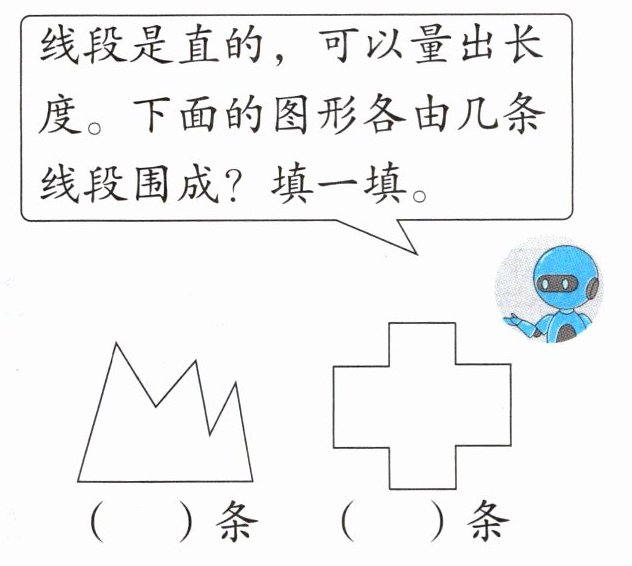 线段是直的,可以量出长度。下面的图形各由几条线段围成?填一填。