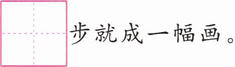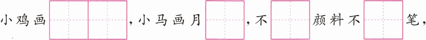 小鸡画$\begin{array}{|c|c|}\hline zhú & yè \\ \hline & \\ \hline \end{array}\\ \hline & \\ \hline $,小马画月$\begin{array}{|c|}\hline yá \\ \hline \\ \hline \end{array}\\ \hline \\ \hline $,不$\begin{array}{|c|}\hline yòng \\ \hline \\ \hline \end{array}\\ \hline \\ \hline 颜料不\begin{array}{|c|}\hline yòng \\ \hline \\ \hline \end{array}\\ \hline \\ \hline $笔,$\begin{array}{|c|}\hline jǐ \\ \hline \\ \hline \end{array}\\ \hline \\ \hline $步就成一幅画。