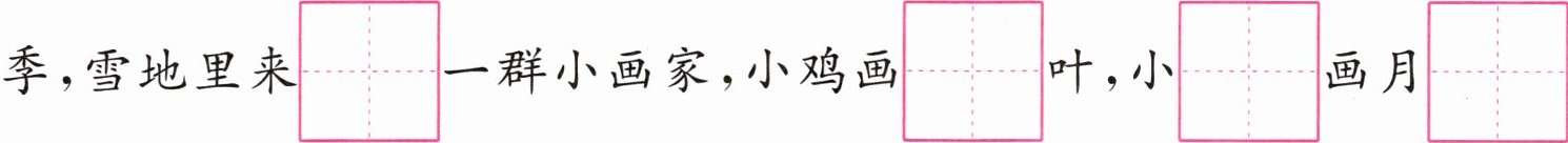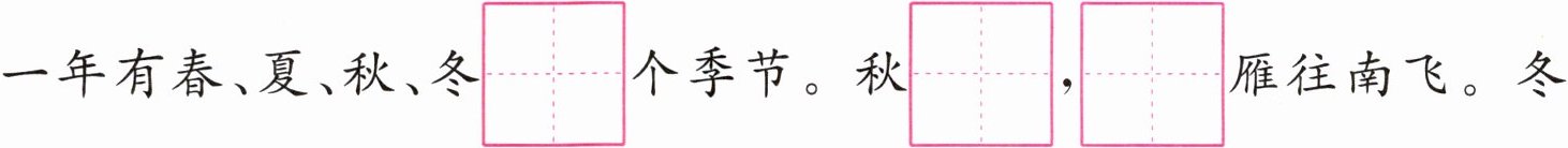 一年有春、夏、秋、冬$\overset{\mathrm{sì}}{□ □ □ □ }$个季节。秋$\overset{\mathrm{tiān}}{□ □ □ □ }$,$\overset{\mathrm{dà}}{□ □ □ □ }$雁往南飞。冬季,雪地里来$\overset{\mathrm{le}}{□ □ □ □ }$一群小画家,小鸡画$\overset{\mathrm{zhú}}{□ □ □ □ }$叶,小$\overset{\mathrm{mǎ}}{□ □ □ □ }画月\overset{\mathrm{yá}}{□ □ □ □ }$。