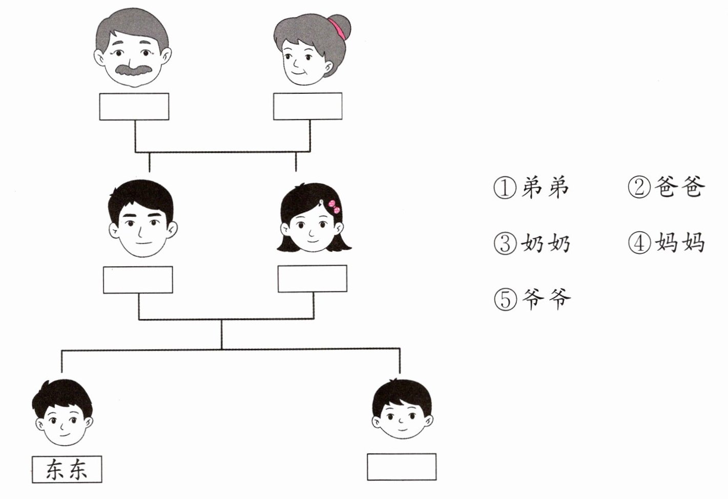 一、下面是东东家的家庭成员图,请把称呼填在对应的位置上。(填序号)