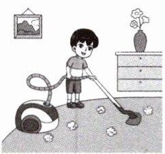 $□$B. He's sweeping the floor.