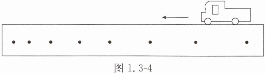 12. 把带有墨水装置的小车放在水平桌面上的纸带上,小车每隔相等的时间滴一滴墨水。当小车向左做直线运动时,在纸带上留下了一系列墨滴,其分布情况如图1.3-4所示。设小车滴墨水的时间间隔为 $ t $,在小车从图中第一滴墨水的位置至最后一滴墨水的位置的运动过程中,下列说法正确的是(