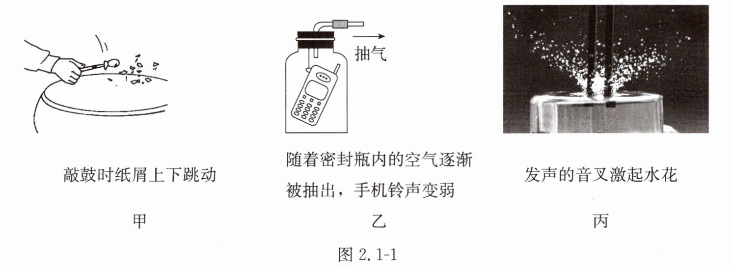 8. 某同学在学习声音时的实验情境如图2.1-1所示,其中图甲是研究声音产生时的实验情境,图乙、丙的实验目的与其相同的是图______(选填“乙”或“丙”)。