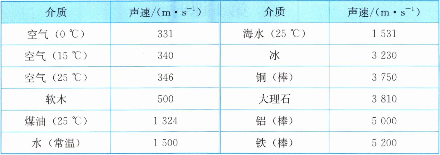 |介质|声速/(m·s⁻^1)|介质|声速/(m·s⁻^1)|