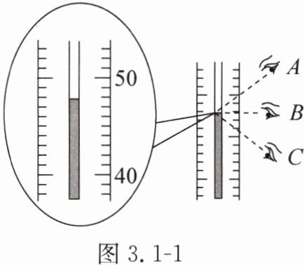 1. 测量工具的使用和读数有很多相似的地方,比如刻度尺和温度计。温度计使用时,视线与温度计______(如视线B),读数步骤:确定零刻度线→确定示数在零上还是零下→确定分度值→确定示数。图3.1-1中温度计的示数为______℃。