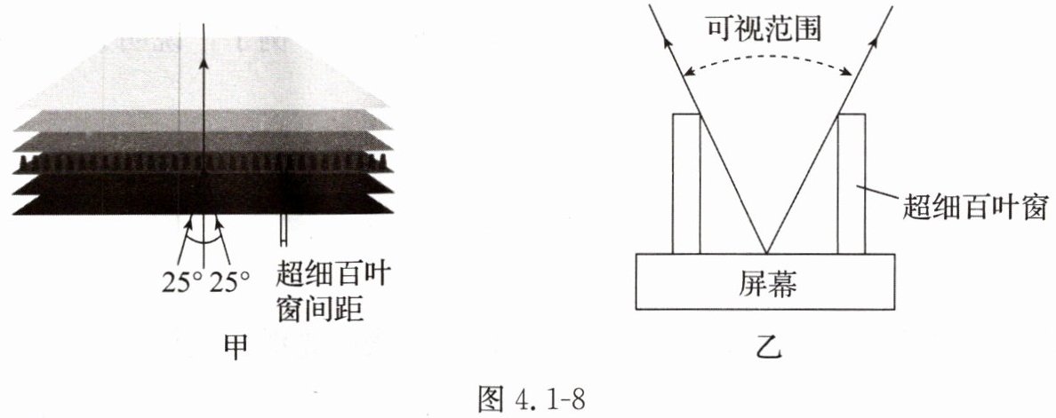 12. 手机防窥膜结构图如图4.1-8甲所示,它采用了超细百叶窗光学技术,其原理类似百叶窗,结构简图如图4.1-8乙所示。在两侧之所以看不清屏幕内容,是由于光
