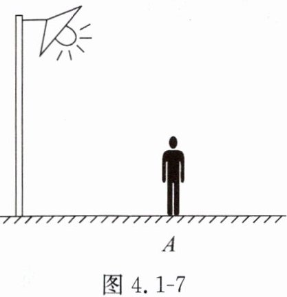 11. 小华从夜晚的路灯下走过时,在地面上观察到了自己的影子,如图4.1-7所示。请在图中画出小华站在路灯下A点处时形成影子的光路及此时影子的范围AB。