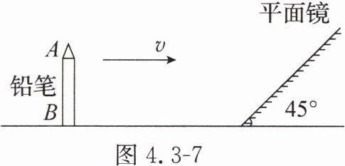 11. 如图 4.3 - 7 所示,平面镜以 $ 45^{\circ} $ 角倾斜放在水平面上。若一支直立的长 $ 12 $ cm 的铅笔 $ AB $,以 $ 5 $ cm/s 的水平速度向平面镜匀速靠近,则此铅笔的像相对于平面镜的速度为