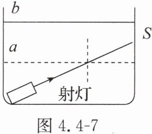 9. 某校新建成一个喷水池,在池底安装一只射灯。当池内无水时,射灯发出的一束光照在池壁上,在$ S $点形成一个亮斑,如图4.4-7所示。往池内注水,当水面升至$ a $位置时,站在池旁的人看到亮斑的位置在$ P $点;若当水面升至$ b $位置时,人看到亮斑的位置在$ Q $点,则( )。