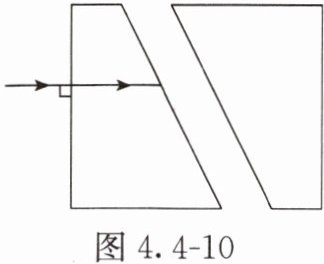 12. 将一矩形玻璃砖从中间斜切后,向左右沿水平直线拉开一小段距离,如图4.4-10所示。一束光从左侧面垂直射入,画出这束光从右侧玻璃砖射出的折射光路图,保留作图痕迹。