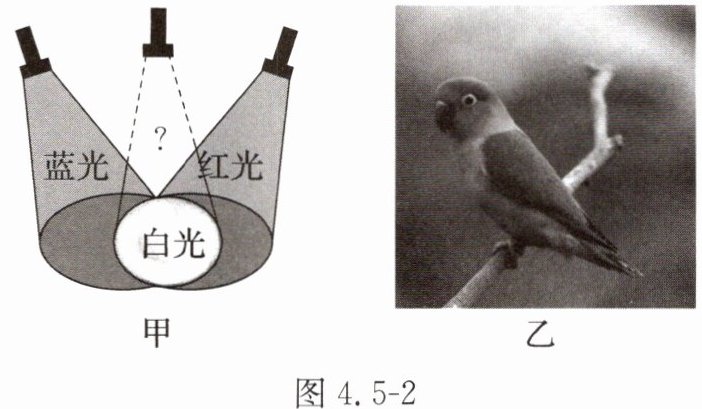 、蓝三种色光照到白纸上(如图4.5-2甲所示),中间相互重叠区域会出现白色。当白光照到鹦鹉图片上时(如图4.5-2乙所示),鹦鹉的嘴呈红色,翅膀呈绿色;当用红光照射时,嘴呈红色,翅膀呈黑