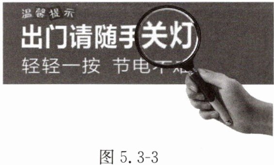 1. 某同学通过焦距为10cm的凸透镜看到了提示牌上“关灯”两字放大的像,如图5.3-3所示。下列说法正确的是(