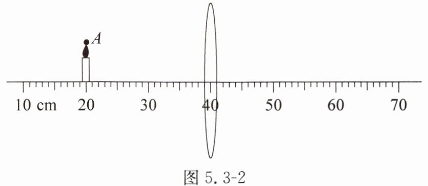 2. 如图5.3-2所示,凸透镜的焦距为10cm,蜡烛放在图示位置,A为烛焰上一点,请在图中画出A点经过凸透镜所成的像,并标出A点对应的像$A'$点。