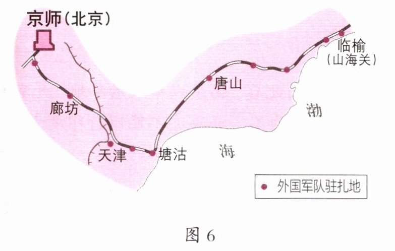 (2) 写出图6中列强可以在北京至山海关铁路沿线驻扎军队的原因。