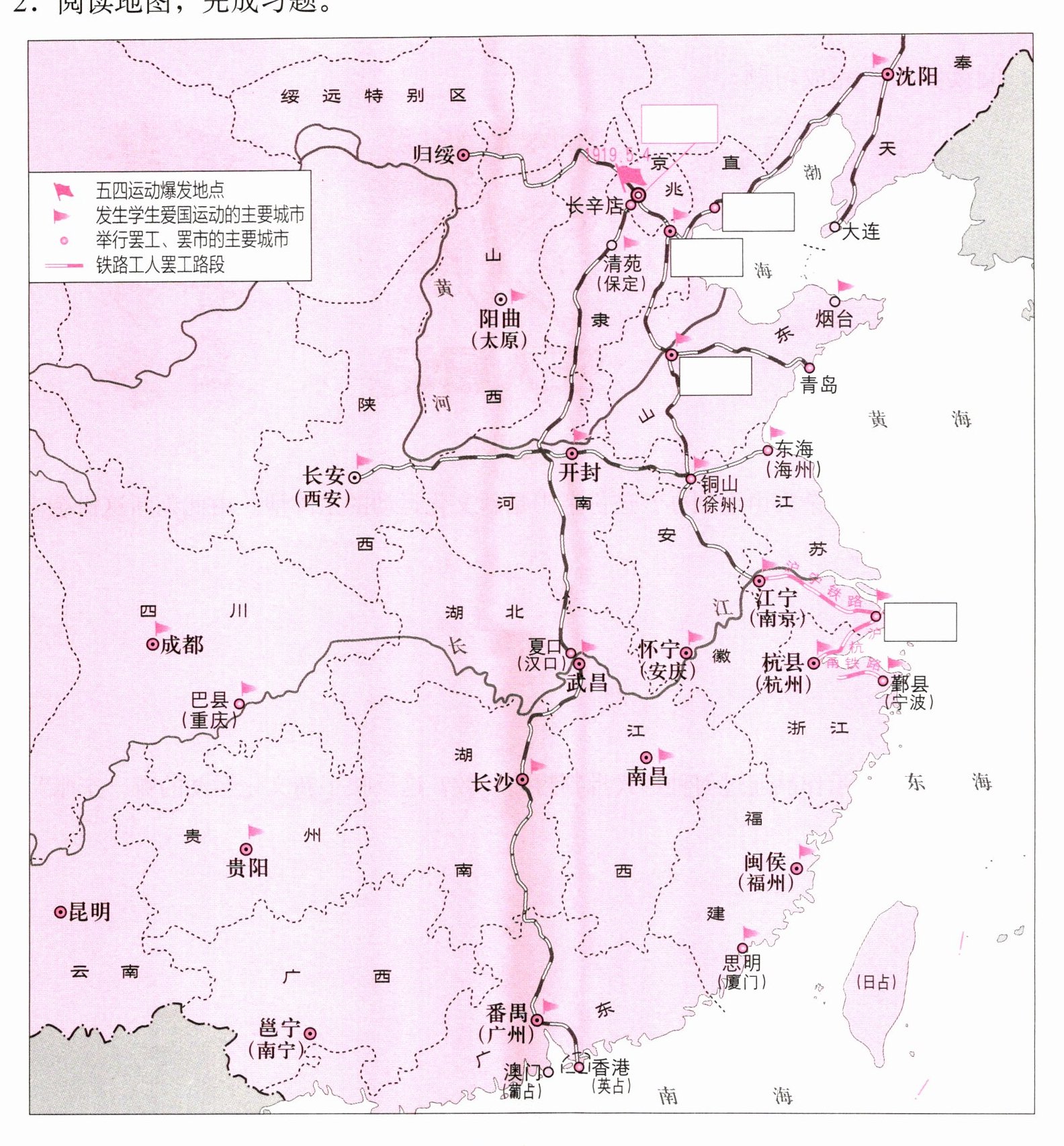 (1) 在图中红框内填写五四运动最先爆发的城市名称。在黑框内填写举行罢课、罢工、罢市的城市名称。
