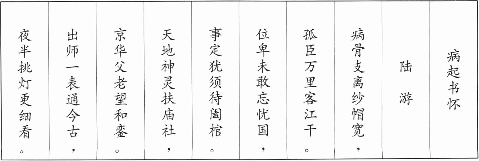 |病起书怀|陆游|病骨支离纱帽宽,|孤臣万里客江干。|位卑未敢忘忧国,|事定犹须待阖棺。|天地神灵扶庙社,|京华父老望和銮。|出师一表通今古,|夜半挑灯更细看。|