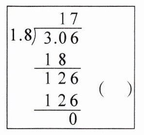 $ \begin{array} { r } { 1 7 } \\ { 1. 8 \longdiv { 3. 0 6 } } \\ { \frac { 1 8 } { 1 2 6 } } \\ { \frac { 1 2 6 } { 0 } } \end{array} $