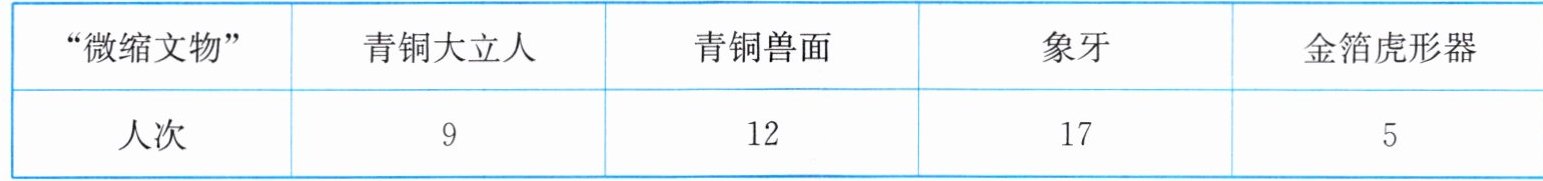 2. 五(1)班同学在参观四川三星堆博物馆时,参加了“考古盲盒”挖掘的活动,下面是同学们挖出“微缩文物”的情况。根据表中的数据推测,“考古盲盒”中