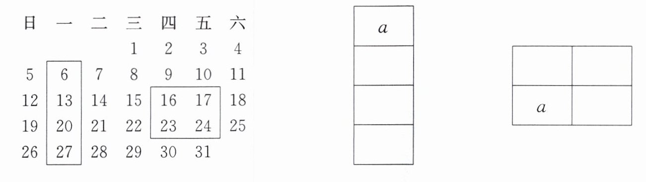 5. 如图,用不同的长方形在月历卡上任意框出4个数。如果用$a$表示框中的一个数,那么每个框中其余3个数应该怎样表示?
