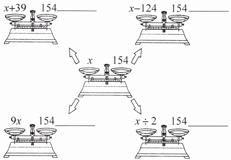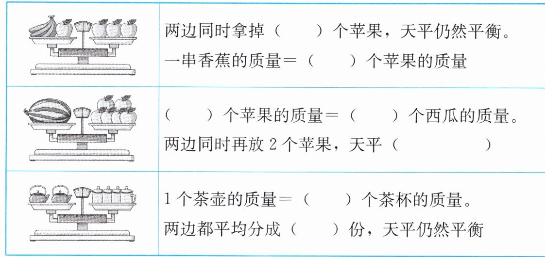 2. 在横线上填上适当的符号和数,使天平平衡。