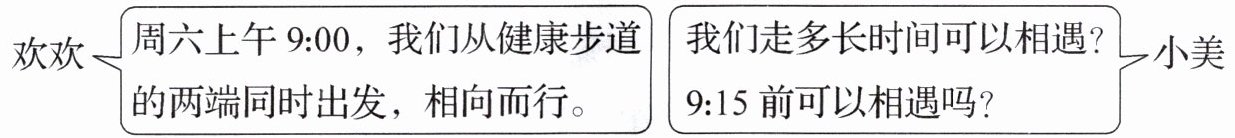 欢欢$\begin{cases}周六上午9:00,我们从健康步道\\的两端同时出发,相向而行。\end{cases}$ $\begin{cases}我们走多长时间可以相遇?\\9:15前可以相遇吗?\end{cases}$小美