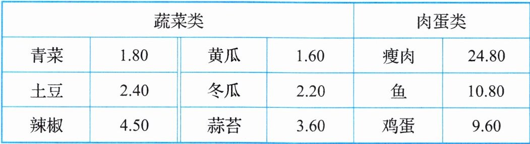 7.有多种配菜方案,合理即可。参考:方案一:蔬菜类青菜:0.8千克,土豆:0.7千克肉蛋类瘦肉:1.2千克1.80×0.8+2.40×0.7+24.80×1.2=32.88(元)方案二:蔬菜类黄瓜:0.5千克,辣椒:1千克肉蛋类鱼:1.2千克1.60×0.5+4.50×1+10.80×1.2=18.26(元)