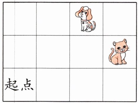 从起点到小狗位置:向右跳3格,再向上跳2格。