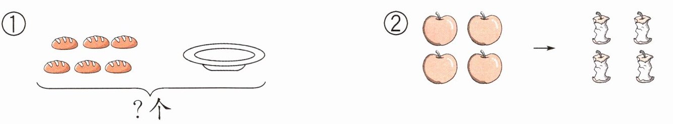 ①中求面包的总数,左边有6个面包,右边盘子里没有面包,求一共有多少个面包,就是把左边的6个面包和右边盘子里的0个面包合起来,用加法计算。