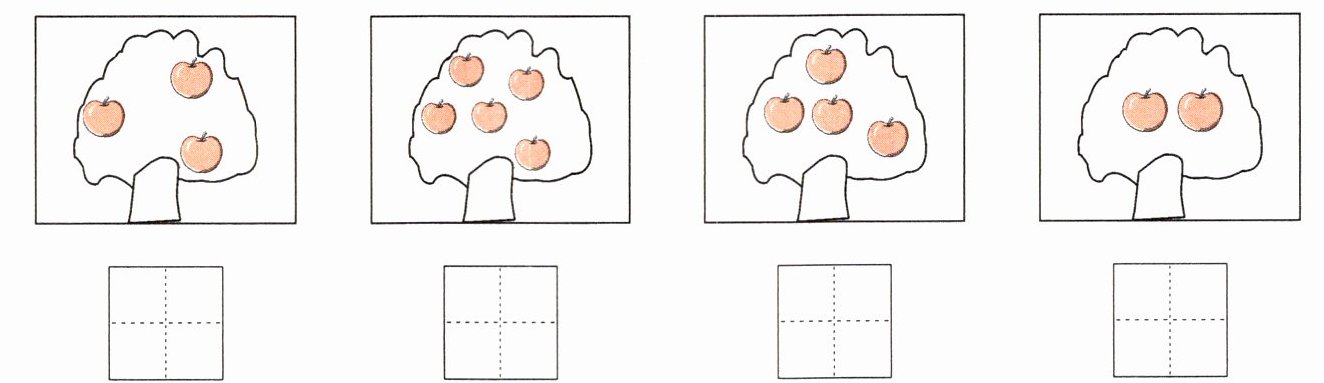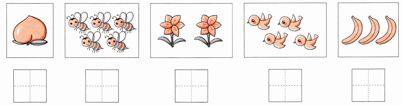 解析:题目给出了五组图形,从左到右依次是一个桃子、六只蜜蜂、两朵花、四只小鸟、三根香蕉;下方对应有五个空白田字格,要求数出图形的数量并写出来。考查数数和数字书写的能力。