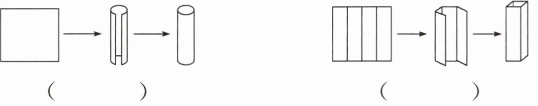 解析:本题考查了平面图形与立体图形的对应关系,通过动手操作或空间想象,将平面图形进行卷、折等操作,得到相应的立体图形。对于第一个图形,把长方形沿着一条边卷一卷,会得到一个圆柱;对于第二个图形,把长方形沿着连接各边中点的线折一折,会得到一个长方体。