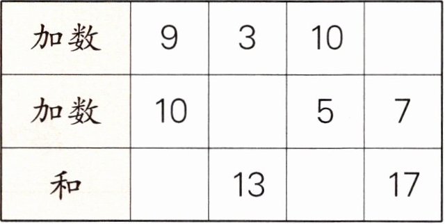 对于第三行第四列:已知两个加数分别是$10$和$7$,和是$10 + 7 = 17$(此行为原表格就正确的,无需修改)。