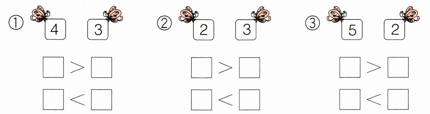 答案:①$4>3$,$3<4$;②$3>2$,$2<3$;③$5>2$,$2<5$。