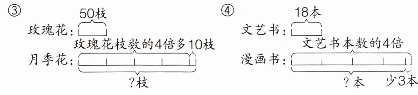解析:考查已知一个数,求这个数的几倍多(少)几的运算。先用玫瑰花的枝数乘以$4$得到玫瑰花枝数的$4$倍,再加上$10$枝就是月季花的枝数。