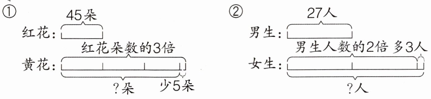 解析:考查已知一个数,求这个数的几倍多(少)几的运算。先用红花的数量乘以$3$得到红花数量的$3$倍,再减去$5$朵就是黄花的数量。