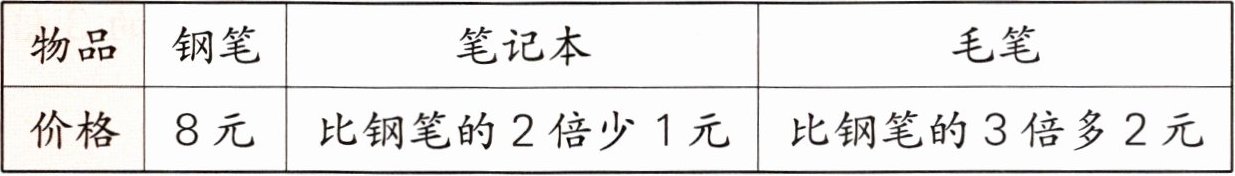 | 价格 | 8 元 | 比钢笔的 2 倍少 1 元 | 比钢笔的 3 倍多 2 元 |
