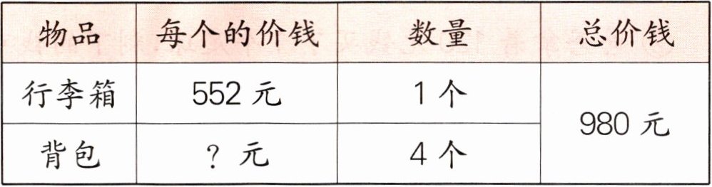 首先,我们可以从总价钱中减去行李箱的价钱,来得到4个背包的总价钱。