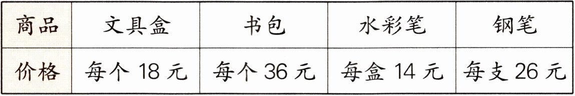 | 商品 | 文具盒 | 书包 | 水彩笔 | 钢笔 |
