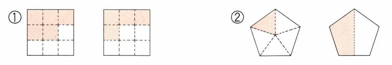 ②由图可知,第一个图形把长方形平均分成$5$份,阴影部分占$2$份,用分数表示为$\frac{2}{5}$;第二个图形把长方形平均分成$5$份,阴影部分占$4$份,用分数表示为$\frac{4}{5}$。