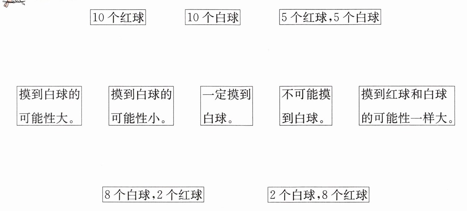 摸到白球的可能性大。 摸到白球的可能性小。 一定摸到白球。 不可能摸到白球。 摸到红球和白球的可能性一样大。