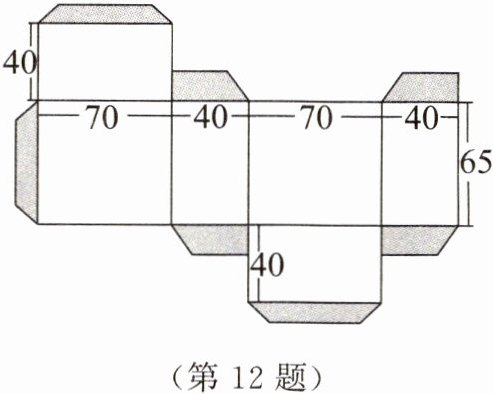 12. 某班数学活动小组的同学们用纸板制作长方体包装盒,其表面展开图和相关尺寸(单位:mm)如下,其中阴影部分为内部粘贴角料,求此长方体包装盒的体积。