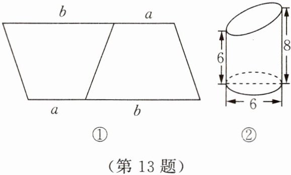 13. 如图,图②是圆柱被一个平面斜切后得到的几何体,类比图①中梯形面积公式的推导方法,求图②中几何体的体积。(结果保留 π)
