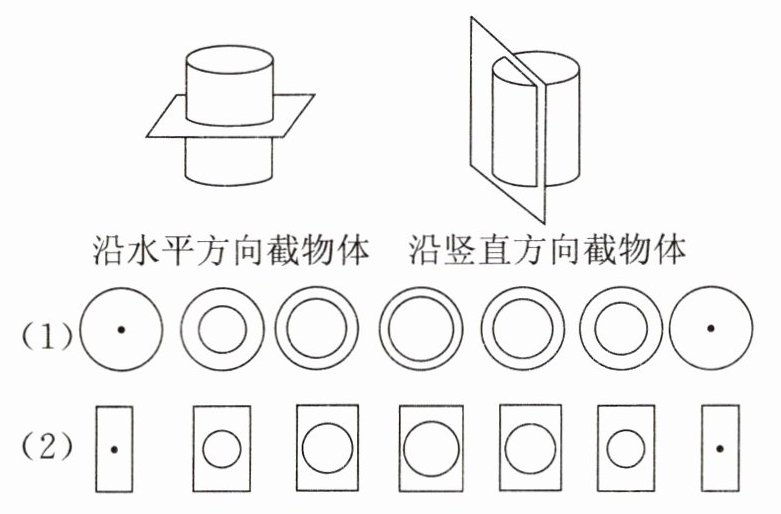 (综合与实践)如图,有一个外观为圆柱形的物体,它的内部构造看不到。当分别用一组平面沿水平方向(自上而下)和竖直方向(自左而右)截这个物体时,得到了如图所示的(1)(2)两组形状不同的截面,请你试着说出这个物体的内部构造。