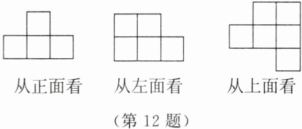 12. 在一个仓库里堆积着若干个正方体的货箱,要搬运这些箱子很困难,可是仓库管理员要落实一下箱子的数量,于是就想出一个办法,将从正面、左面、上面看这堆货物得到的形状图画了出来,如图。你能根据这三个图形帮他清点一下箱子的数量吗?