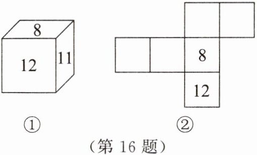 16.(综合与实践)如图①,已知一个正方体的六个面上分别写着六个连续的整数,且每两个相对面上的两个数的和都相等,图中所能看到的数是$8$,$11和12$。求出这六个整数,并把它们分别填入如图②所示的正方体表面展开图中。