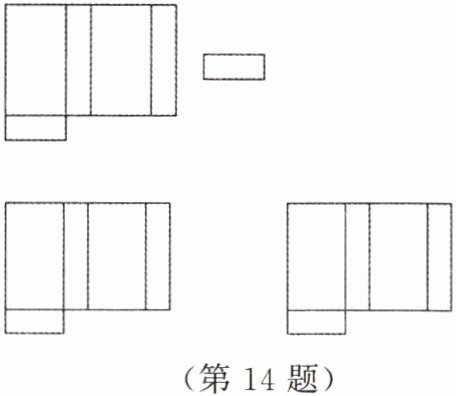 14. 工人把一个长方体的纸盒展开时不小心多剪了一刀,结果展开后变成了两部分,如图。现在他想把这两部分粘贴成一个整体,使之能折成原来的长方体,请你帮他设计一下应怎样粘贴。(要求用两种不同的方法粘贴)