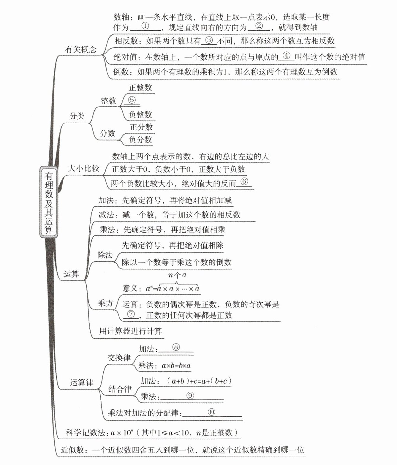 ①单位长度 ②正方向 ③符号 ④距离 ⑤零 ⑥小 ⑦负数 ⑧$a+b=b+a$ ⑨$(a× b)× c=a× (b× c)$ ⑩$a× (b+c)=a× b+a× c$
