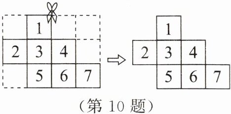 10. 如图,将 $4×3$ 的网格图剪去 5 个小正方形后,还剩下 7 个小正方形,为了使余下的部分(小正方形之间至少要有一条边相连)恰好能折成一个正方体,需要再剪去 1 个小正方形,则应剪去的小正方形的编号是(