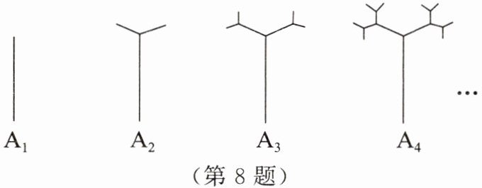 8. 如图所示的是按照一定规律画出的“树形图”,经观察可以发现:图 $ A_2 $ 比图 $ A_1 $ 多出 2 个“树枝”,图 $ A_3 $ 比图 $ A_2 $ 多出 4 个“树枝”,图 $ A_4 $ 比图 $ A_3 $ 多出 8 个“树枝”……照此规律,图 $ A_6 $ 比图 $ A_2 $ 多出的“树枝”个数为(
